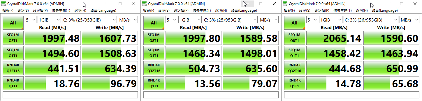 首先在CrystalDiskMark的部份,三次測試結果平均讀取速度爲2020.14 MB/s,平均寫入速度爲1595.97 MB/s。