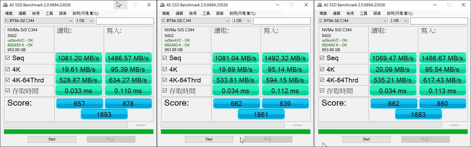 AS SSD Benchmark 的測試結果如上圖,三次測試結果平均讀取速度爲1077.24 MB/s,平均寫入速度爲1481.85 MB/s。