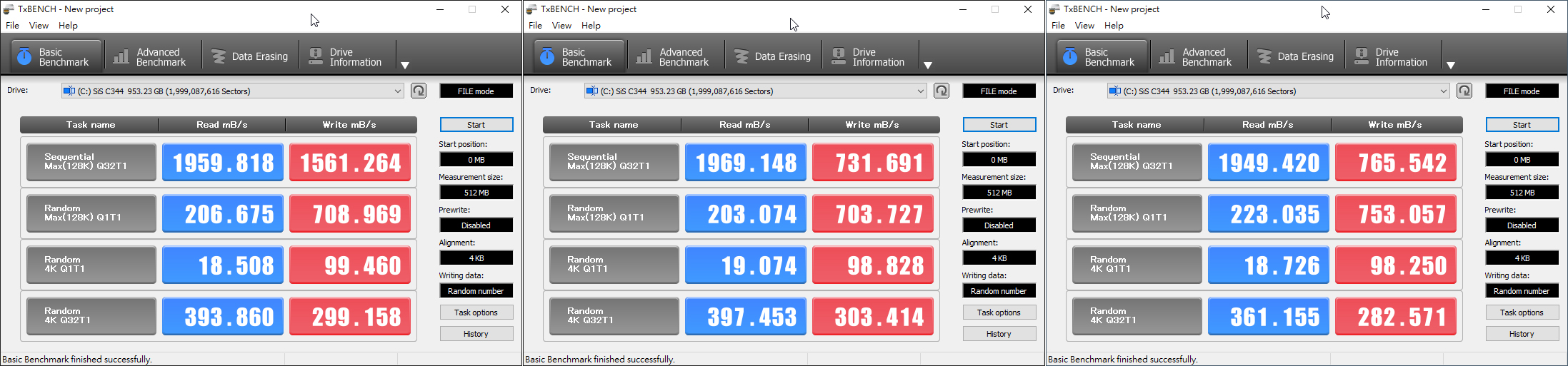 從TxBENCH的測試結果來看,三次測試的平均讀取速度爲1959.462 MB/s,平均寫入速度爲1019.499 MB/s。
