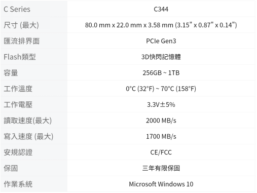 ▲SiS C344系列爲M.2 NVMe PCIe Gen3規格SSD,擁有安裝簡便穩定快速等多項特色