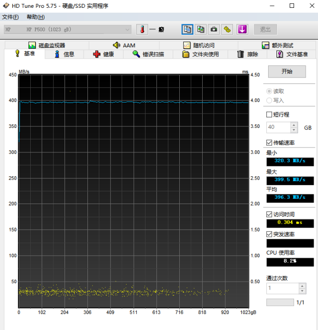 看完了剛剛的測試,是不是覺得速度上有點平淡無奇,下面(miàn)拿出惠普P500的看家本領,穩定性,我用的是HD Tune Pro硬盤測試軟件。