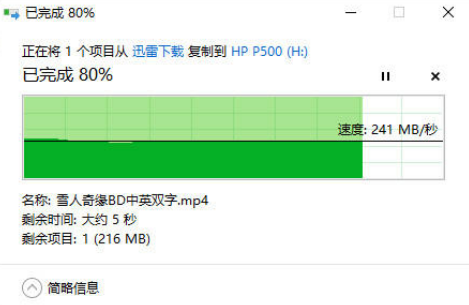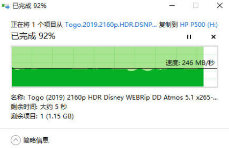 文件傳輸是移動硬盤最主要的使用方法,我找了一部16G的2160P電影《多哥》,來測試這(zhè)款移動SSD的實際使用效果。從實際傳輸表現來看,惠普P500 SSD硬盤在接收電影文件平均爲240~250MB/s,穩定、不掉速。寫入16G電影用時約1分鍾。